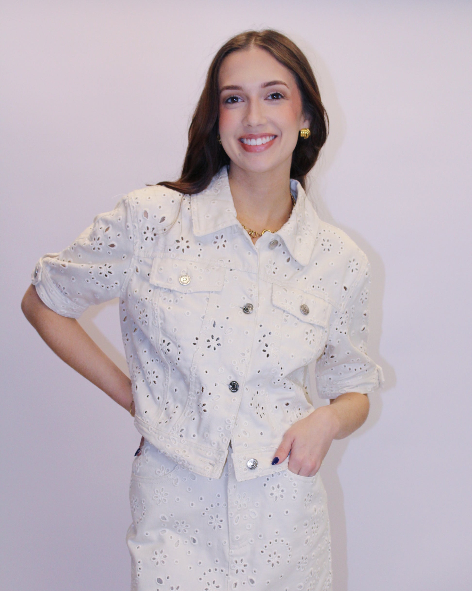 The Beck Eyelet Skirt is your go-to piece for effortless spring style. Designed to complement any tank or blouse, this skirt elevates your seasonal wardrobe with refined detail. For a coordinated look, pair it with the matching Eyelet Jacket to create a polished, put-together ensemble that transitions seamlessly from day to evening.