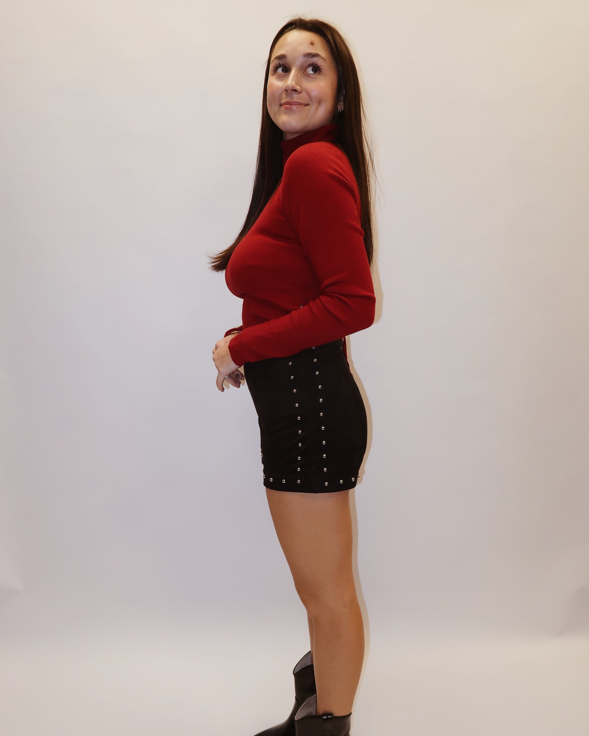 Embrace playful elegance with the Nadia Turtle Neck Knit Top in a stunning ruby hue. Its flirtatious tie-back detail adds a charming twist to the classic turtle neck silhouette, making it perfect for turning heads while staying cozy. This top effortlessly blends comfort and style for your everyday adventures.