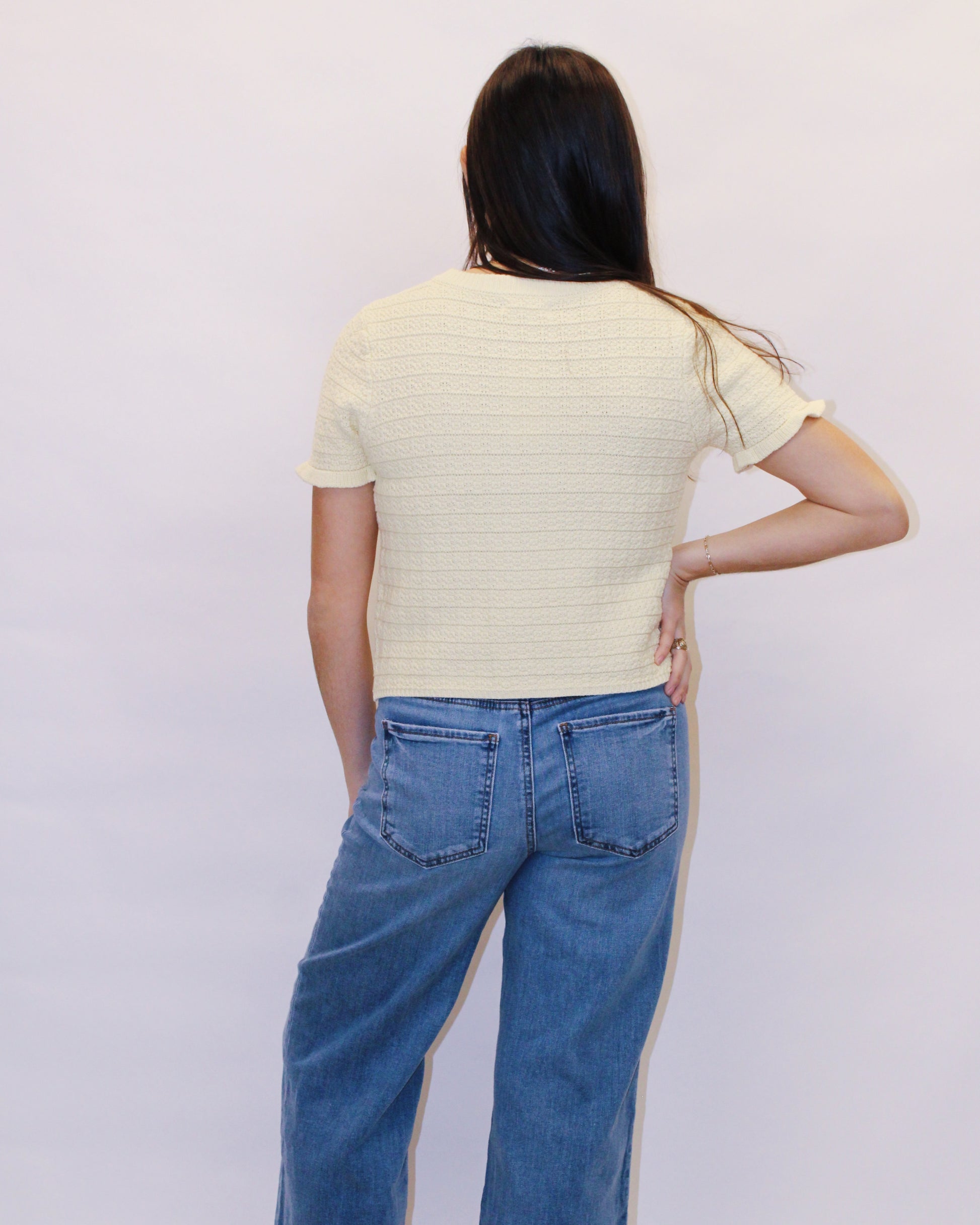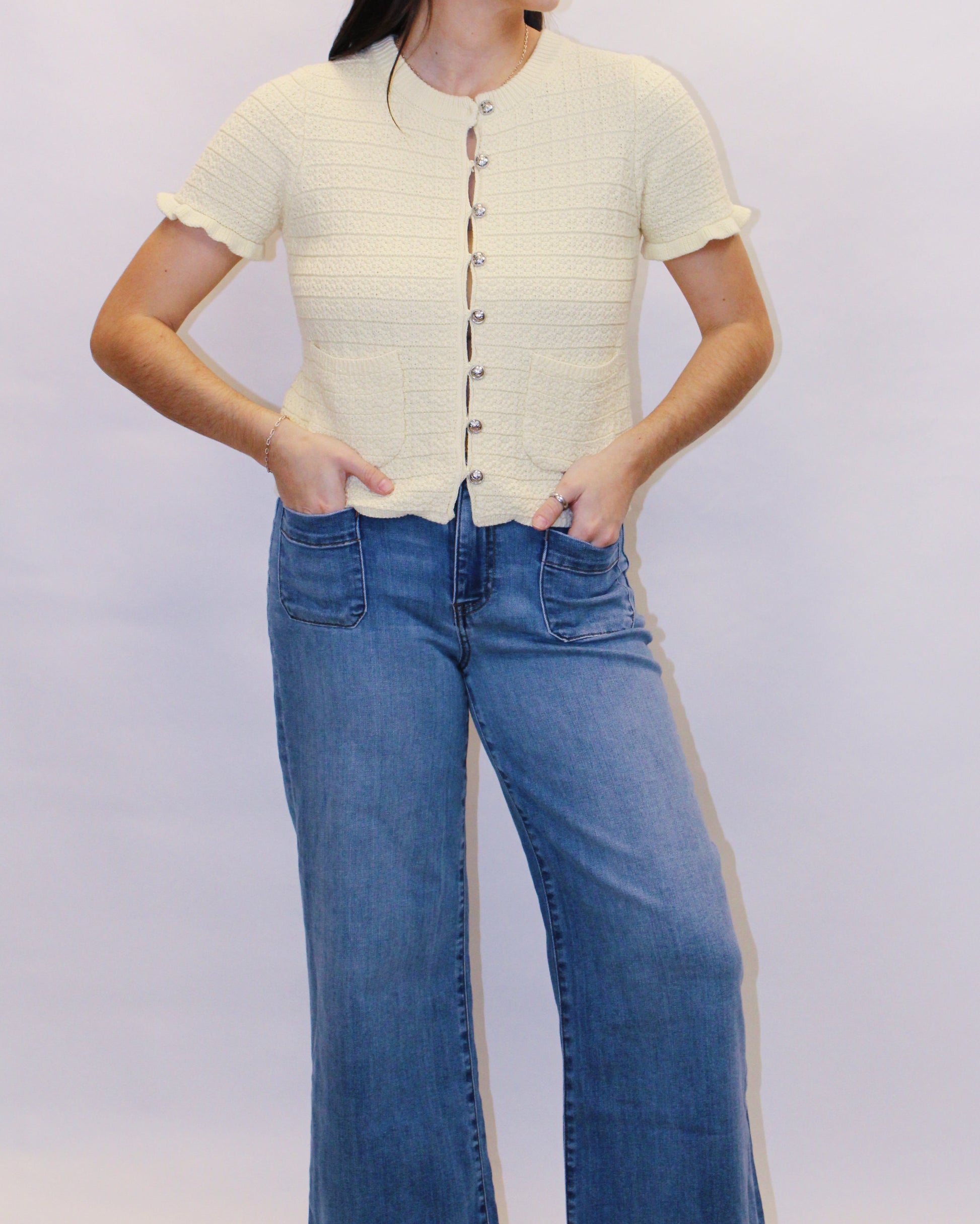 This playful ruffled knit sweater is your new go-to for adding instant charm to any look. With its signature ruffle detailing and airy knit fabric, it's the ultimate layering piece that works year-round. Short sleeves keep things breezy, while the classic button front delivers timeless appeal. Throw it over a dress, pair it with your favorite jeans, or style it with a skirt—however you wear it, you'll love the sweet, romantic vibe it brings to your outfit.